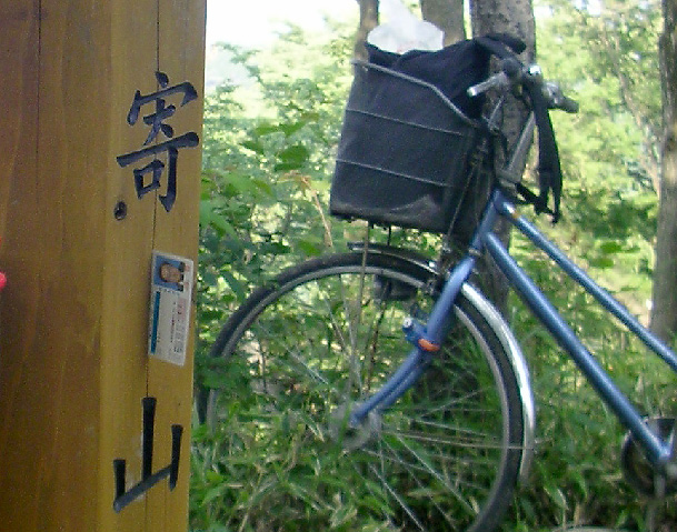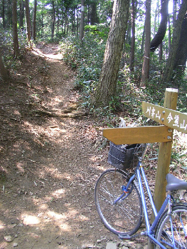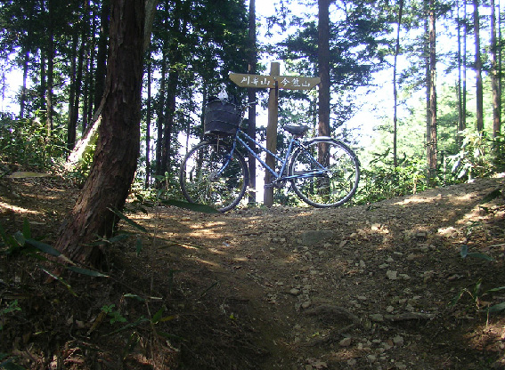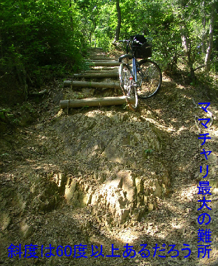 この急登は厳しい 勾配は60度以上あるだろう 左手はハンドル 右手はサドルに 肩をサドル部にあてて押し上げる 階段の無いところは足が滑る 岩場にしっかり踏ん張って グイーっと押し上げ押し上げ 丸太の階段まで来ればあとは楽だ